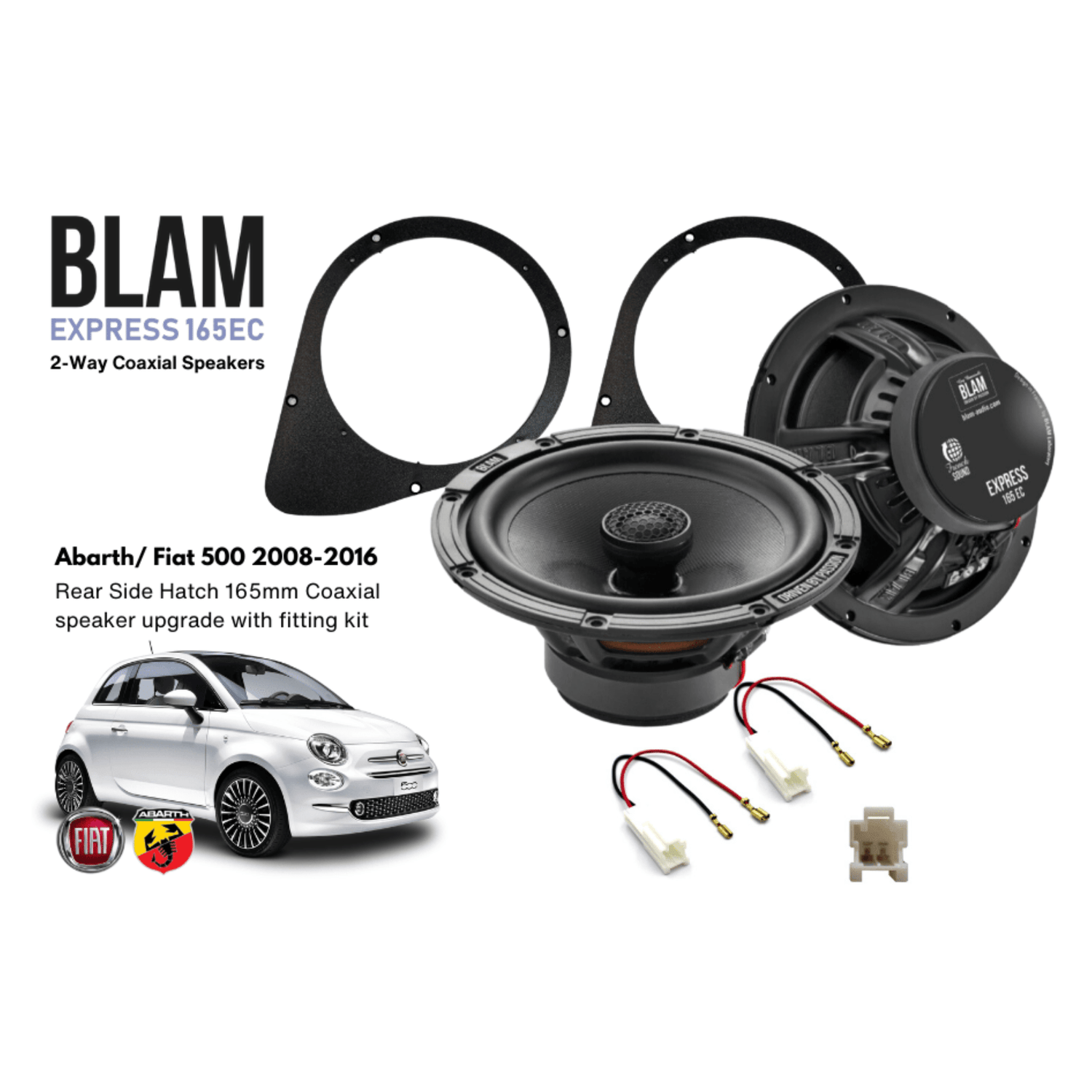 Overview: The BLAM EXPRESS 165EC Rear Side Hatch Coaxial Speaker Upgrade Kit (SFK-FIA2-EC165) is an easy-to-install audio enhancement kit, designed specifically for Abarth and Fiat 500 models from 2008 to 2016. Outfitted with high-quality BLAM 165EC coaxial speakers, this kit brings improved clarity, fuller bass, and brighter highs to your rear-side audio, creating a balanced and immersive listening experience in the vehicle’s cabin.