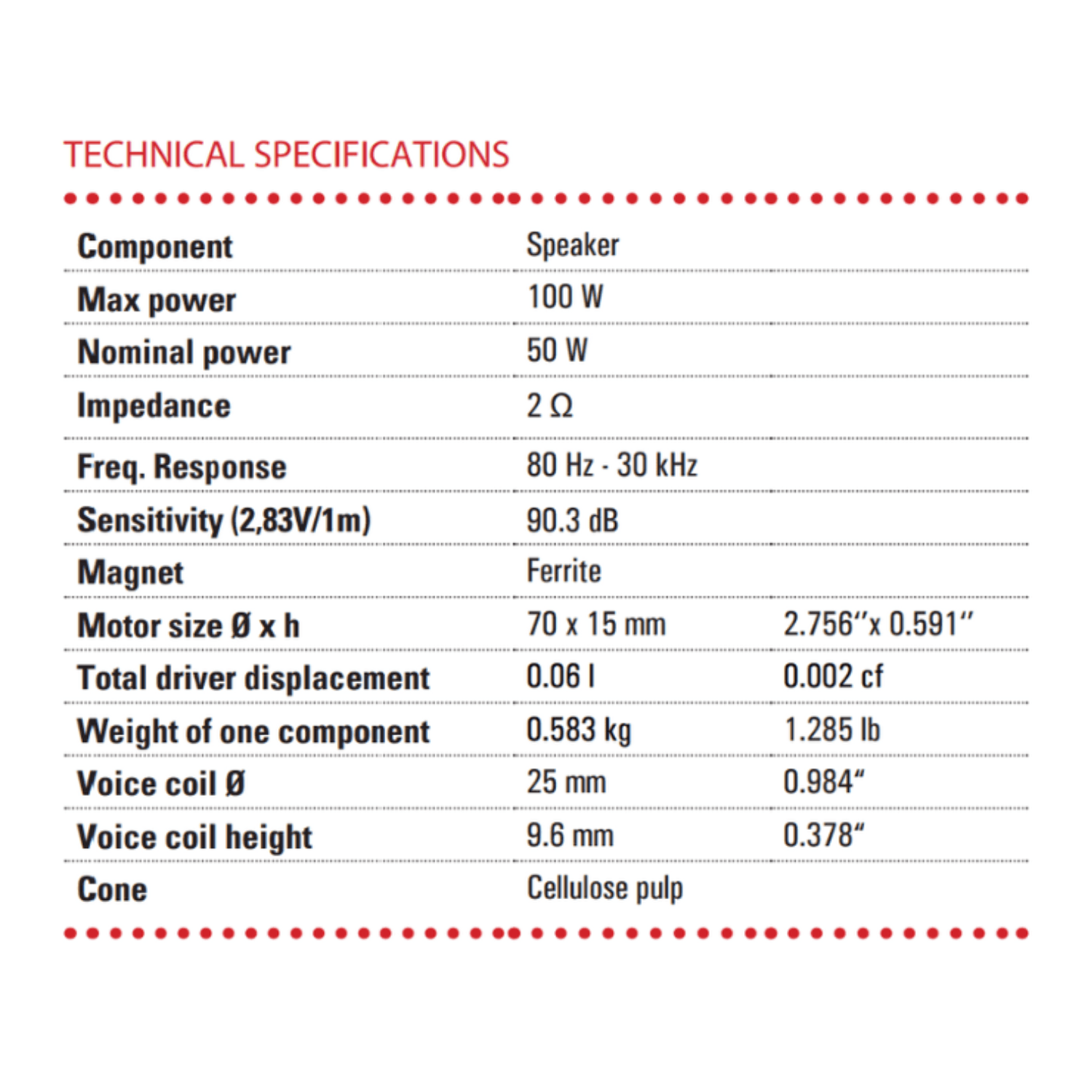 - Sensitivity 90.3 dB – Impedance 2 Ω