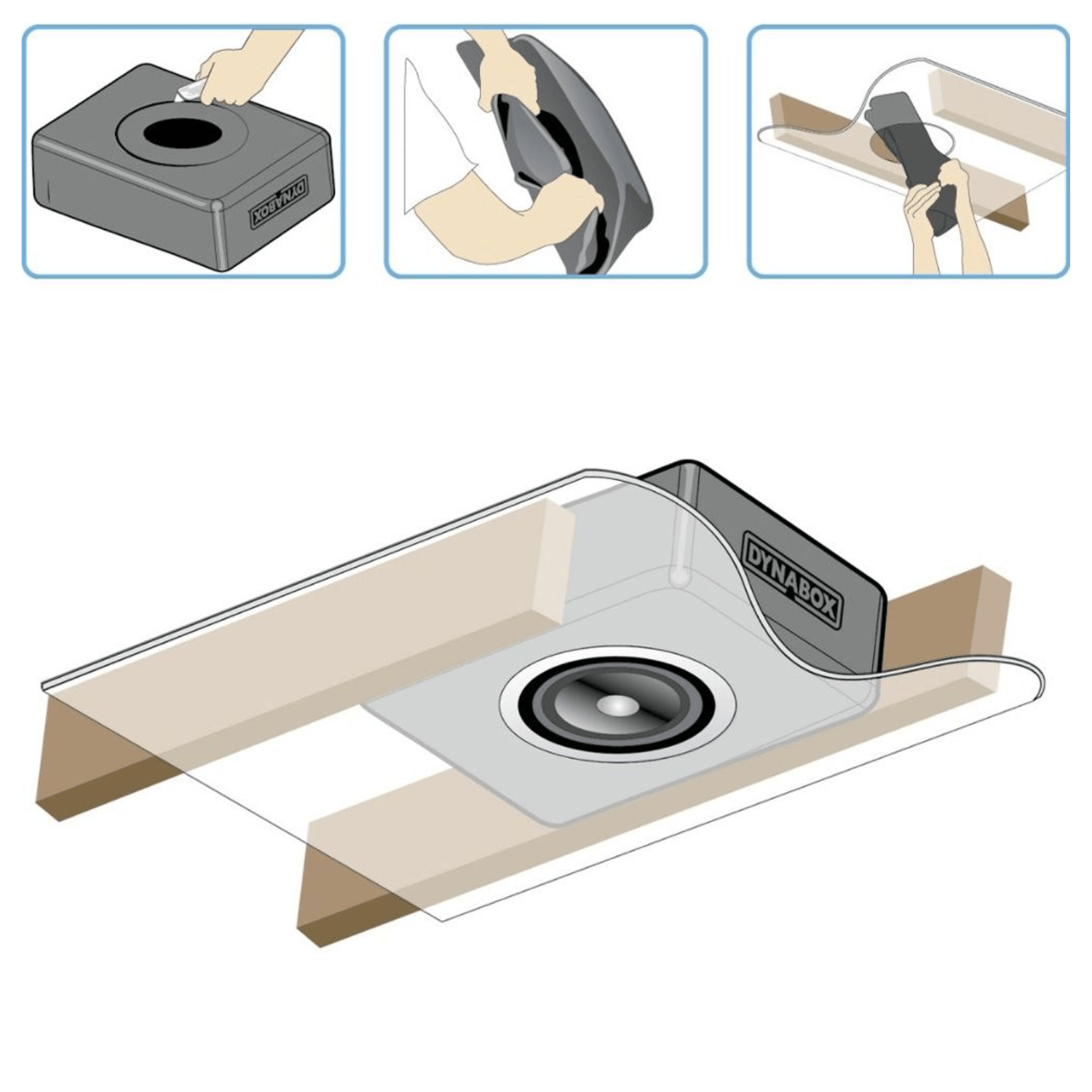 The DynaBox is a unique product that has been designed to eliminate most of the reflected sound energy that is generated by a speaker. Dynabox works by enclosing the rear of the speaker in a sound insulated enclosure that can be compressed to fit through a 165mm hole (or larger) and then return to its original size. This feature enables the Dynabox to be “retrofitted” when sound migration (from the rear of a speaker) generates unwanted sound that travels outside the intended location. There are further important benefits of DynaBox that include an increase in audio performance by the reduction of speaker back-wave and protection of the rear of the speaker.