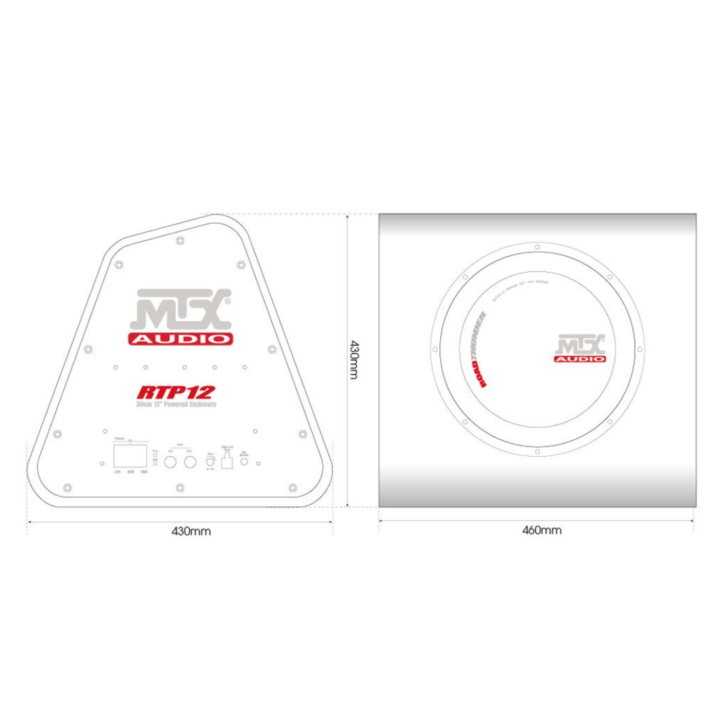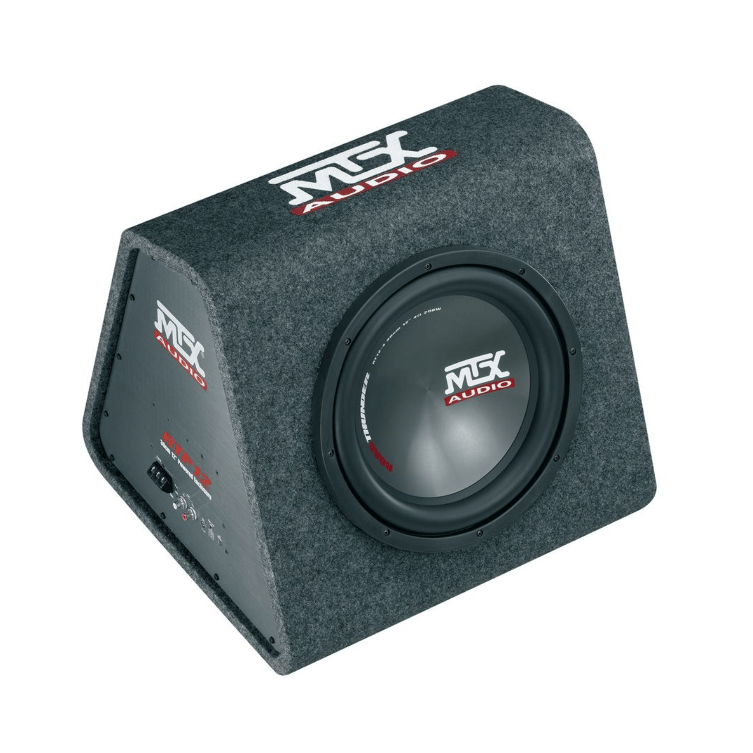 The 30cm MTX RTP12 amplified subwoofer (220W RMS) delivers an impressive, punchy sound reproduction. Featuring an ultra-efficient Class-D amplifier and a 12 inch subwoofer. The side mounted amplifier makes wiring nice and simple.