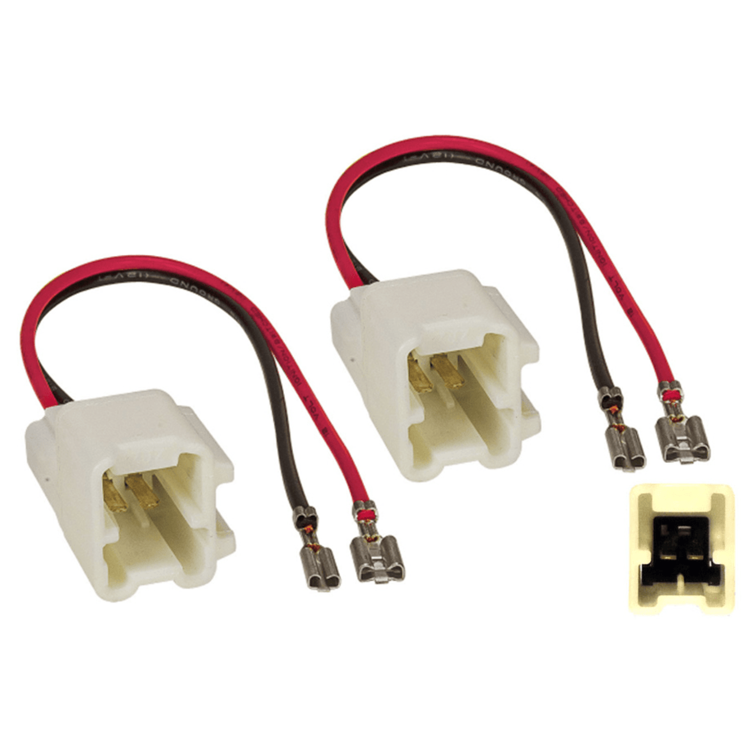 A pair of speaker adapter cables for various Renault vehicle models. Use to fit new aftermarket speakers without needing to cut off the original speaker connectors.