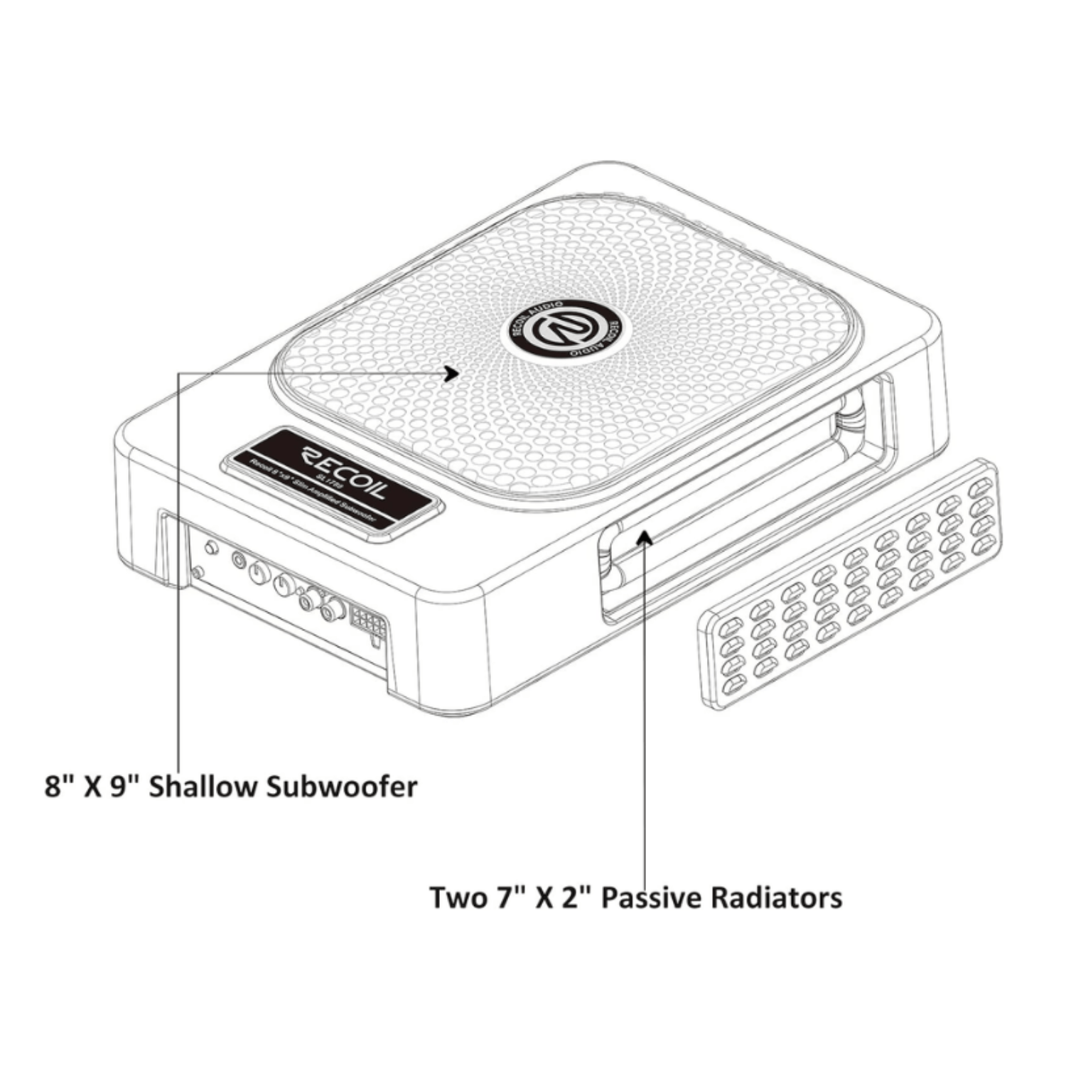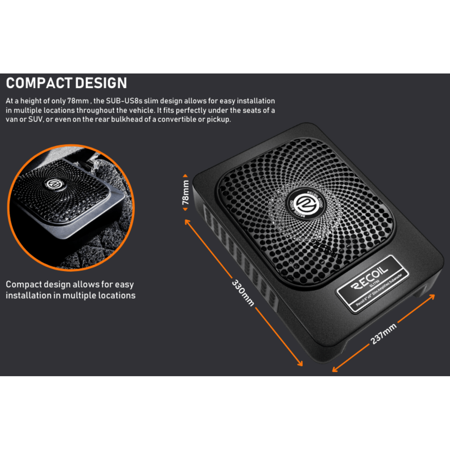 RECOIL SUB-US8 8" (200mm) 550W Slim Amplified Underseat Car Subwoofer With Installation Wiring Kit
