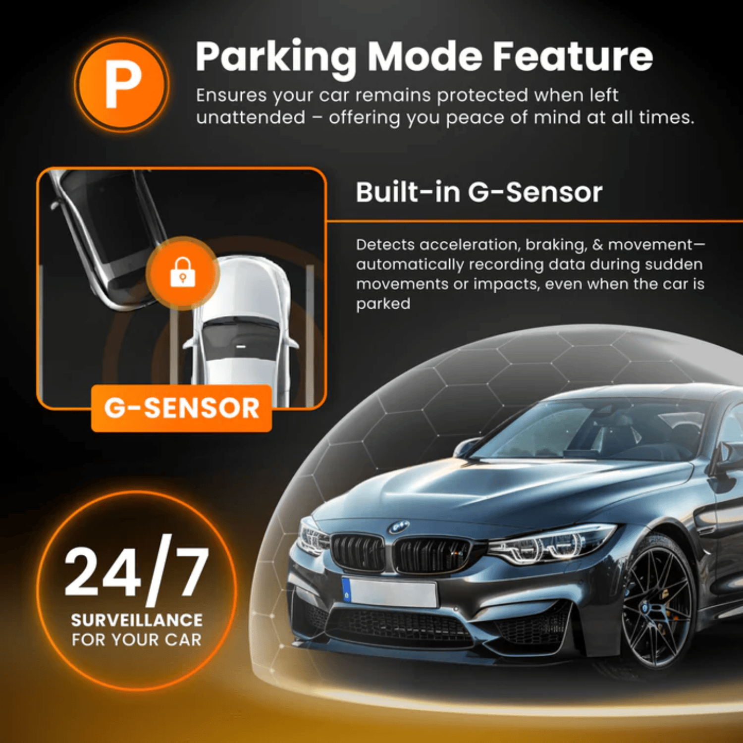 True 24/7 Parking Mode with motion and impact detection (when hardwired)