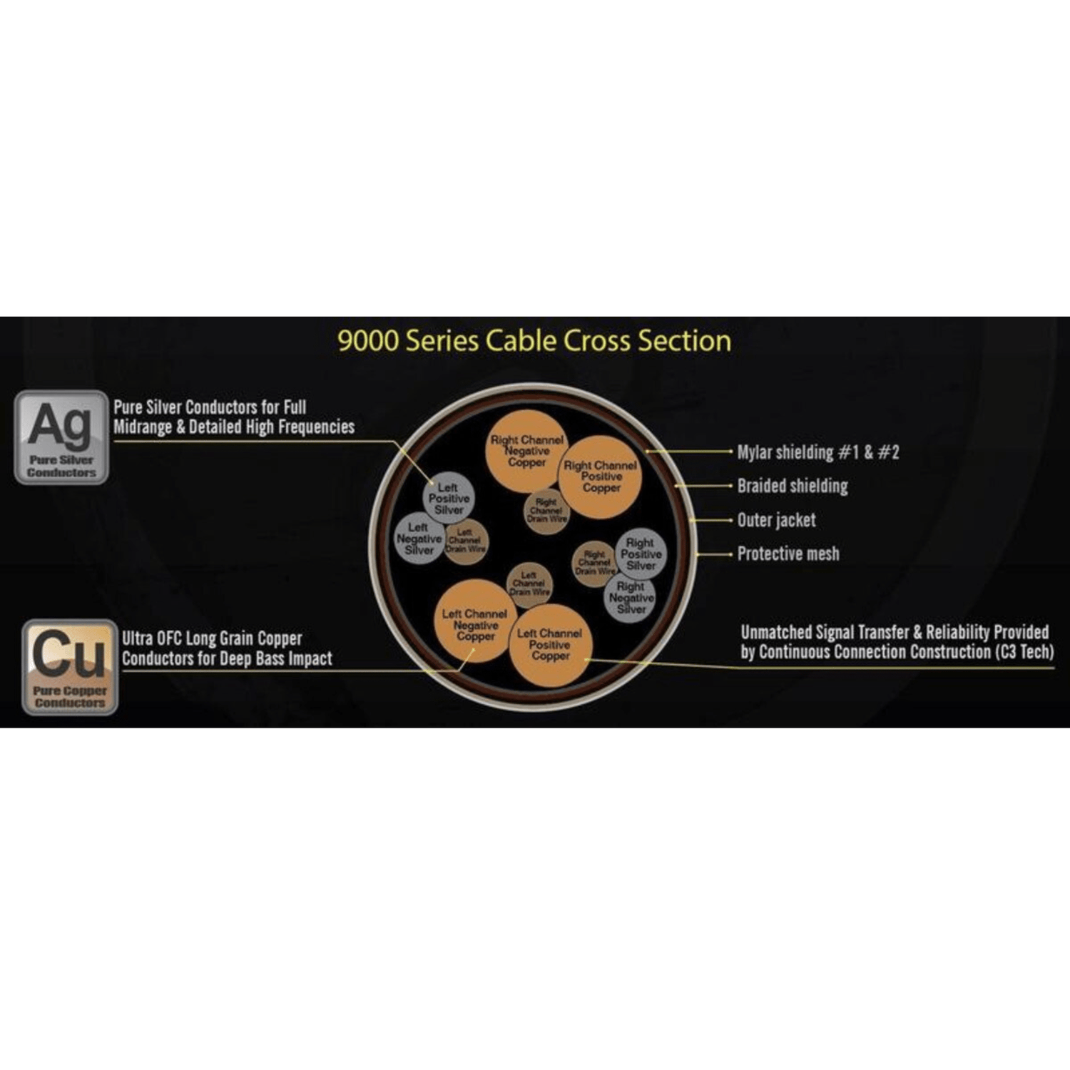 Designed to deliver the best bass response, openness, tonality, and accuracy possible while drastically reducing electrical resistance and interference. Expertly constructed with 12 individual conductors, 6 left and 6 right, pure silver conductors for full midrange and high frequencies, ultra-long grain pure OFC copper for bass frequencies, and rhodium plated RCA ends for conductivity.